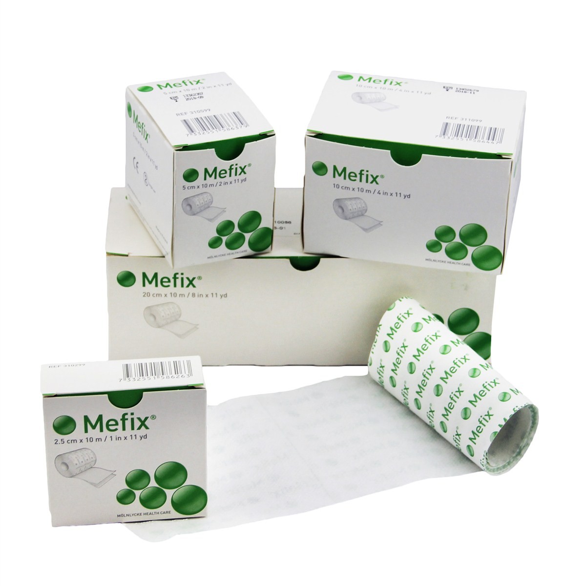 Caixas e rolo de curativo adesivo branco Mefix em fundo branco