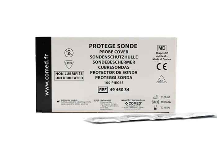 Embalagem de protetores de sonda, branco e preto, texto em várias línguas e símbolos médicos